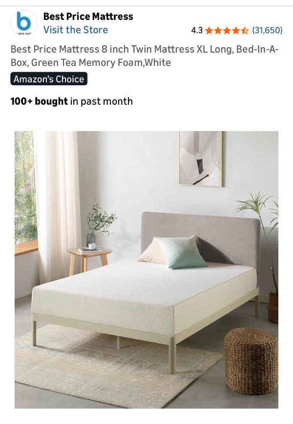 8 Inch Twin XL Mattress from Amazon. Medium Firm.